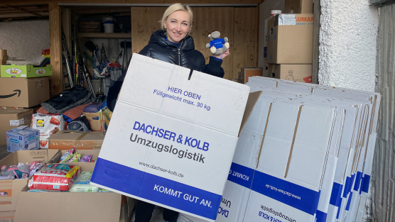 Viele Menschen in der Ukraine, vor allem in den stark umkämpften Städten, sind derzeit in großer Not. Um diese Menschen zu unterstützen hat Eiskunstläuferin Aljona Savchenko Spenden gesammelt. Mit diesen Spenden möchte sie die Bevölkerung in ihrer Heimat rund um die ukrainische Hauptstadt Kiew unterstützen. Für das Sortieren der zahlreichen Spenden hat DACHSER & KOLB entsprechend Umzugskartons gespendet.